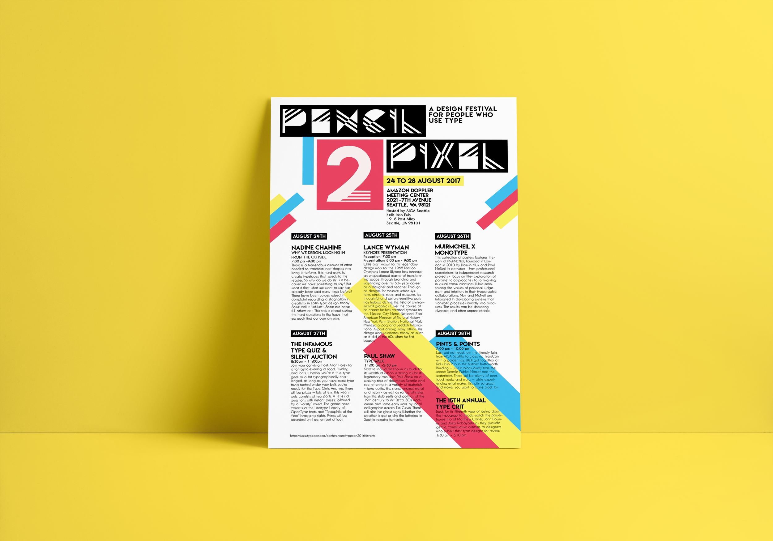 Pencil 2 Pixel is a lecture series concept design focused on the importance and experience that typography can bring to the world. The lecture series designs focused on printed posters and website design. My work depicts the connection between the digital and paper world of typography and design. I use bright primary colors as connectors between the black on white typography that is created with the space around the lettering. I worked in a digital and printed format to further demonstrate the formed environment that we can create through the use of type.